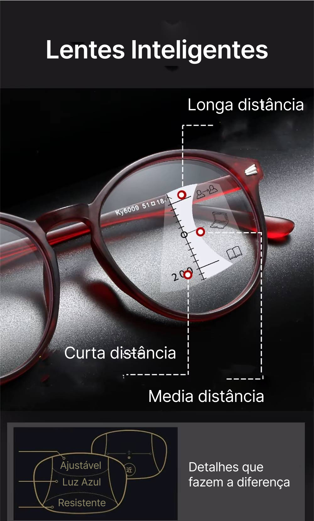 Grau da lente (+) | + 0.50, + 1.00, + 1.50, + 2.00, + 2.50, + 3.00, + 3.50, + 4.00, + 4.50, + 5.00, + 5.50, + 6.00 |